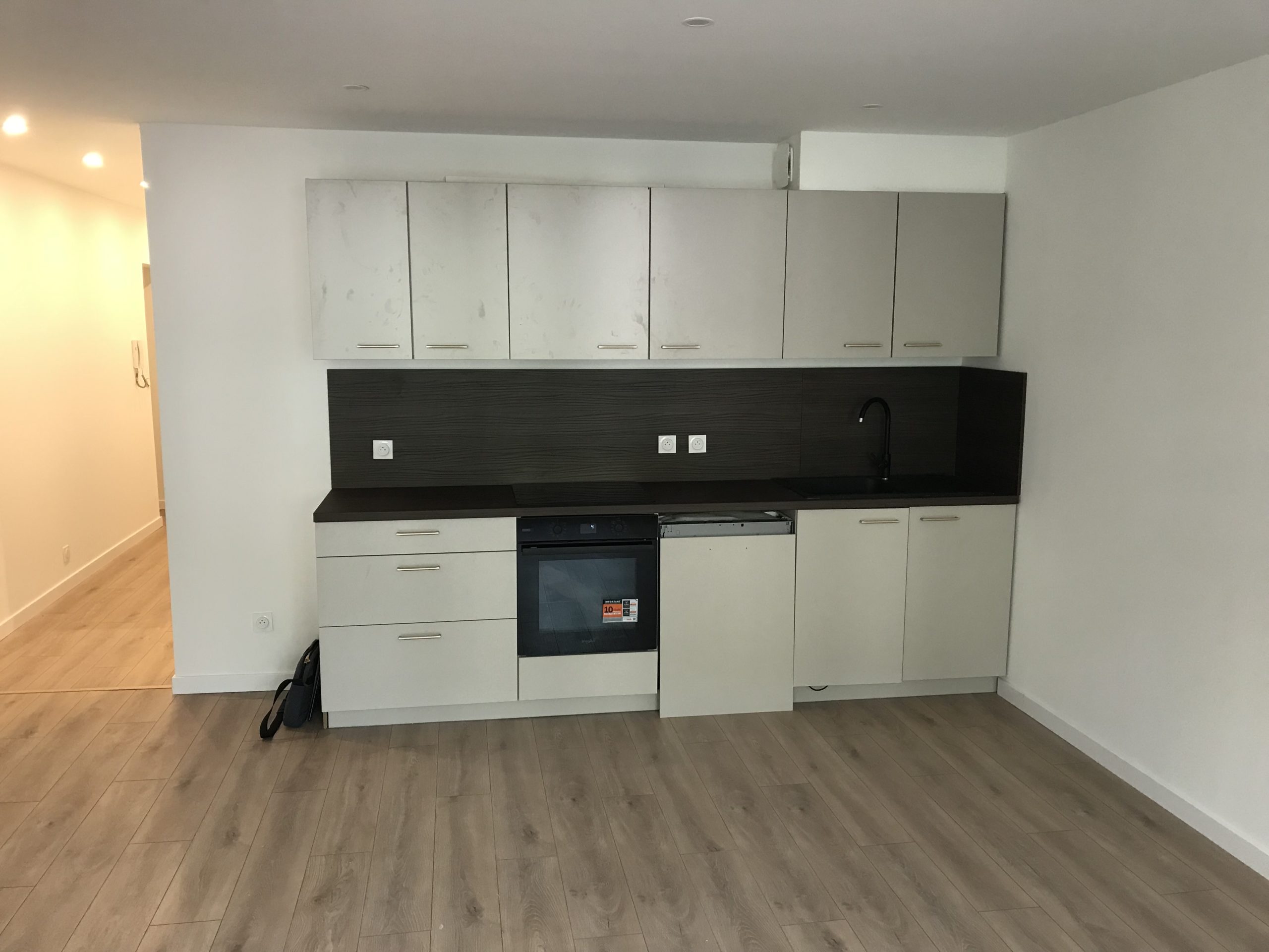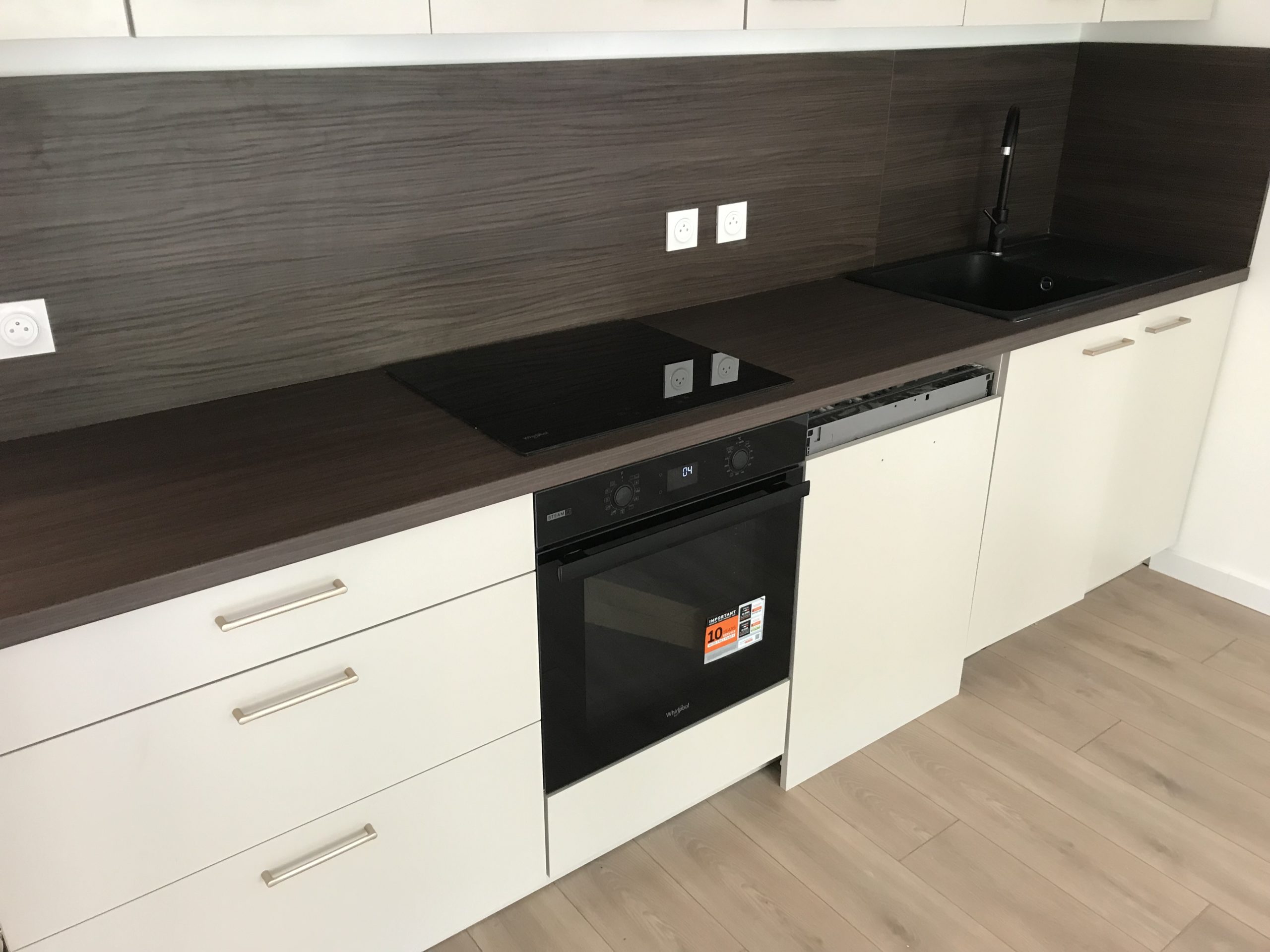 La cuisine est équipée d’un four pyrolyse, d’une plaque induction, d’une hotte aspirante et d’un lave-vaisselle